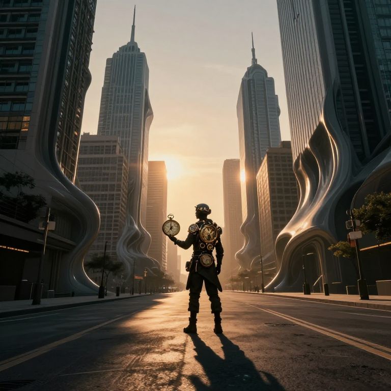 Photorealistic digital illustration of a steampunk cityscape. A large, burning clock tower with gears and an orange, fiery flame emanating from its center stands in the foreground. The clock face is illuminated, displaying Roman numerals. A lone, silhouetted figure in dark clothing stands to the right, observing the scene. The background features tall, industrial buildings with smoke and mist. The ground is wet and reflective, with scattered debris. The overall color palette includes dark blues, grays, and vivid oranges from the flames. The scene is dramatic and dystopian.