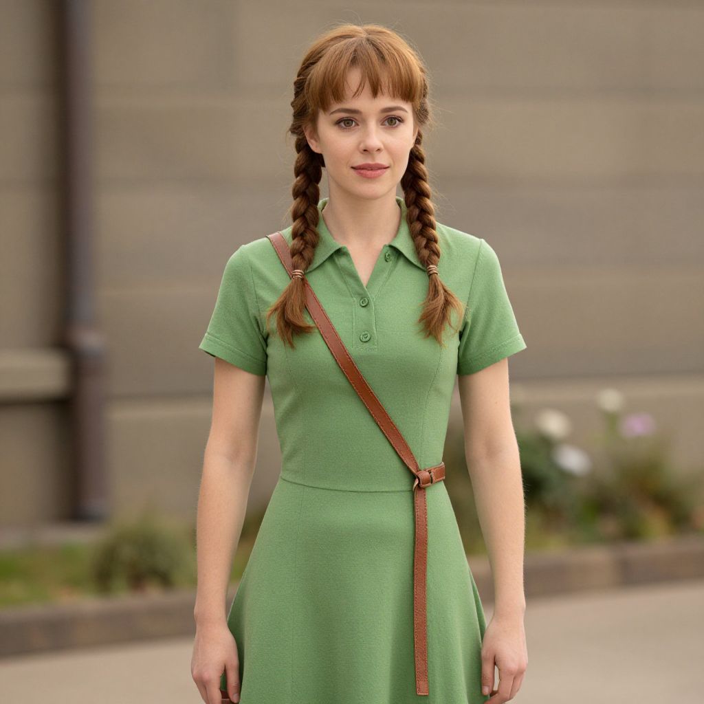 Photograph of a young Caucasian woman with fair skin and light brown hair styled in two braids. She wears a short-sleeved, green, button-up dress that reaches her knees, and a brown crossbody strap bag. She stands outdoors in front of a blurred, gray concrete wall with a small patch of greenery and white flowers in the background. Her expression is neutral, and she has light makeup with pink lipstick. The image has a slightly soft focus, giving it a gentle, almost nostalgic feel. The lighting is natural, suggesting it is daytime.