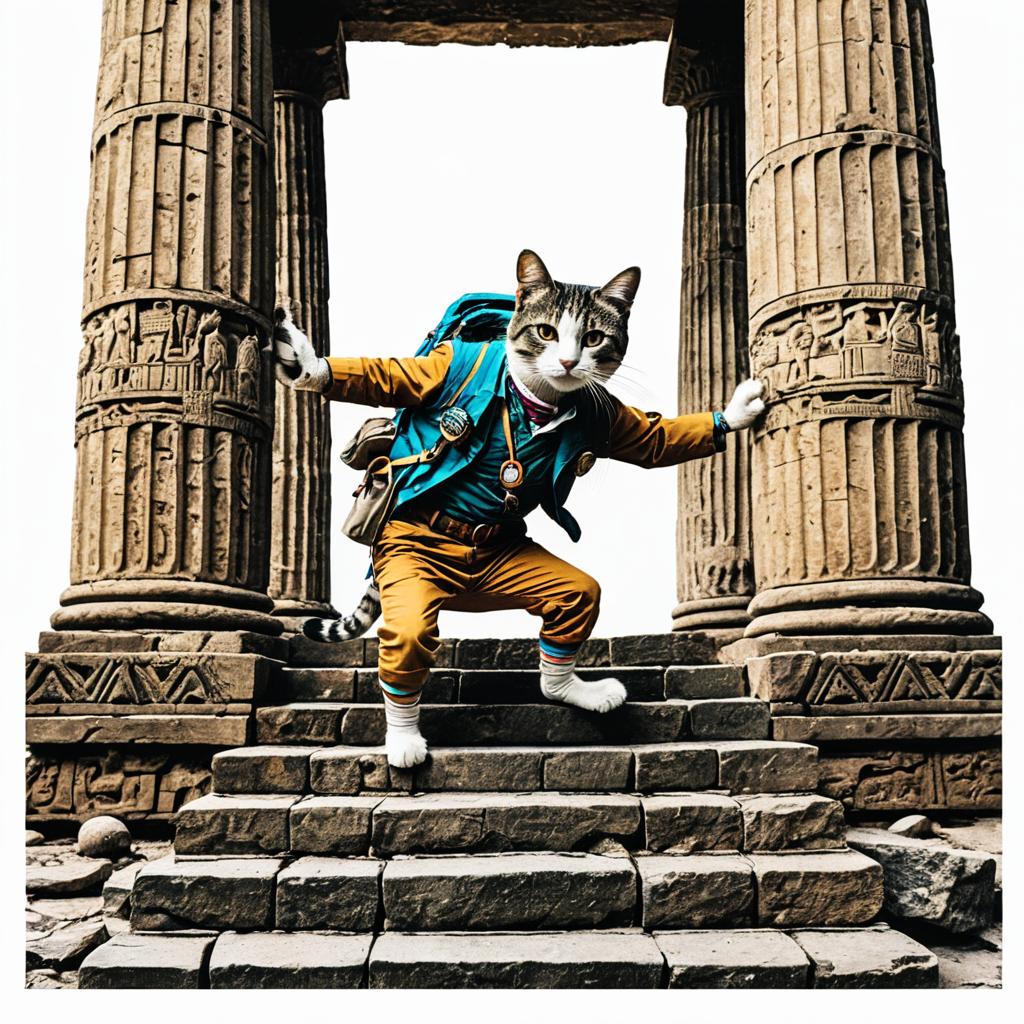 A cat dressed as an archaeologist, climbing into an ancient temple, in a Max Ernst inspired, colorful sticker style, highly detailed, full-body, realistic, white background