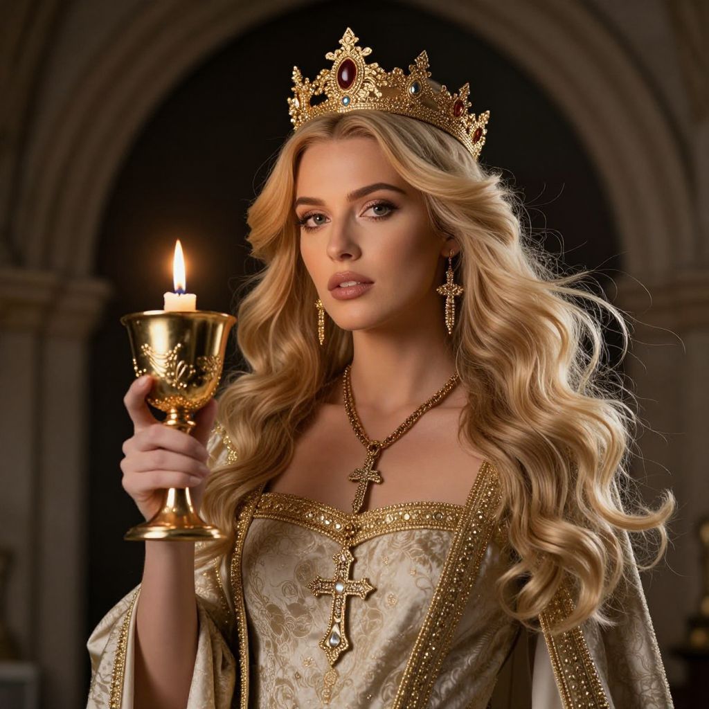 Elegant woman with flowing blonde hair, adorned in regal attire featuring a gold crown and cross necklace, holds a golden chalice with a flickering candle flame, set against a dark, arched stone background.
