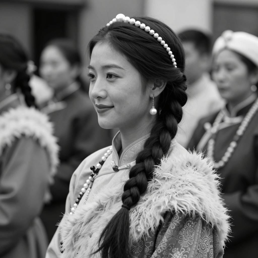 Black and white photograph of a woman with a braided hairstyle, pearl accents, and a fur-trimmed dress, looking to the side with a slight smile. Background shows a group of people, some in traditional attire, slightly blurred.