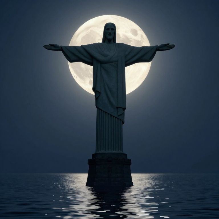 A dramatic 3D-rendered scene featuring the iconic Christ the Redeemer statue silhouetted against a luminous full moon, with a serene body of water reflecting the celestial glow, evoking a mystical and atmospheric visual effect.