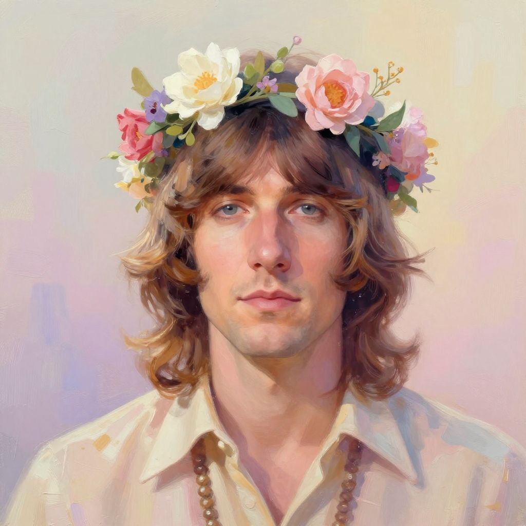 Portrait of George Harrison hippie era, dreamy pastel color palette, ethereal lighting, floral crown, calm and introspective mood, 1960s rock star with spiritual aura, textured brushstroke effect