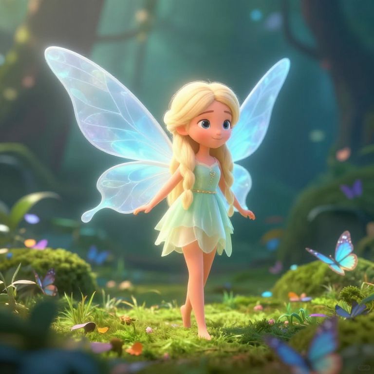 Sandy a beautiful fairy, translucent wings, A land of serenity, butterflies, mossy ground, high definition, dreamy, pixar style,