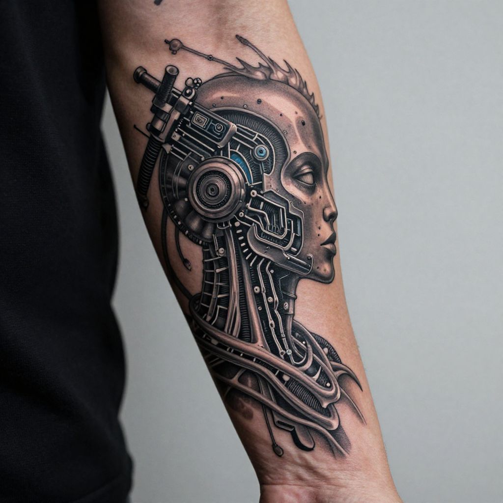 AI tattoo generator concept art showing futuristic robotic arms designing intricate tattoo patterns on human skin, vibrant colors, dynamic light reflections, cyberpunk style, hyper-realistic details, blending technology and art seamlessly