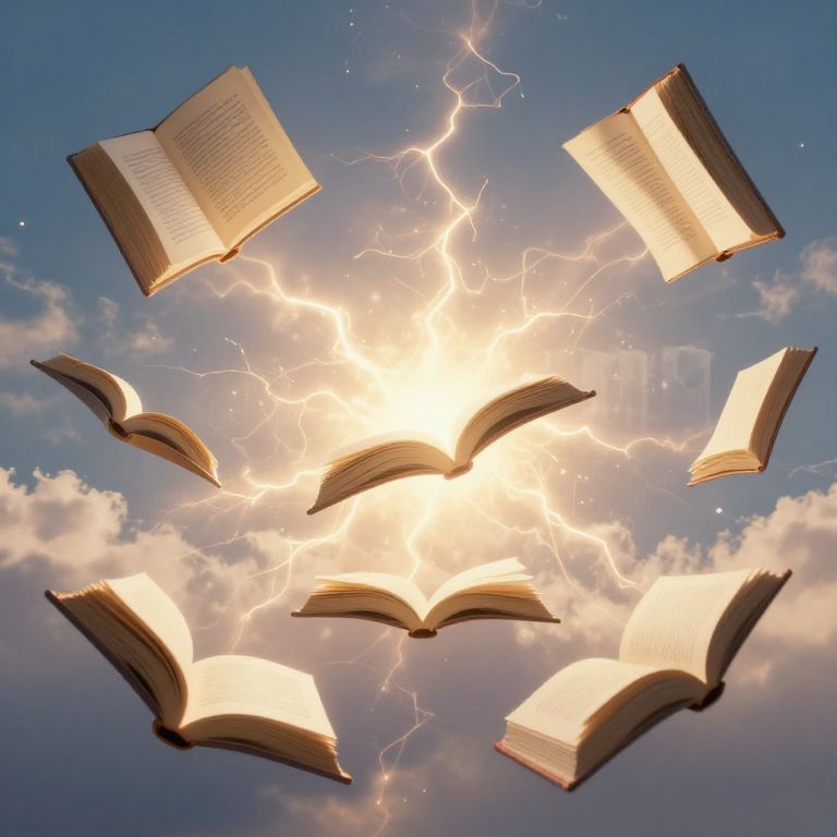 Photograph of six open books with glowing pages surrounded by radiant lightning bolts against a bright, cloudy blue sky.