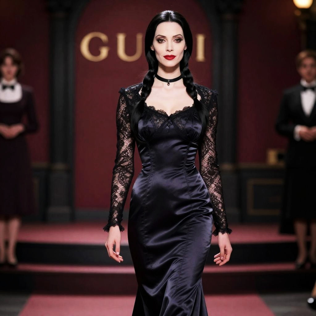 Realistic photo.1990s-style screengrab of Morticia Addams wearing a dark charcoal satin dress with intricate lace sleeves, mermaid skirt. Fashion movie scene, Gucci commercial aesthetic, cinematic composition, richly colored with high fashion vibe. realistic photo