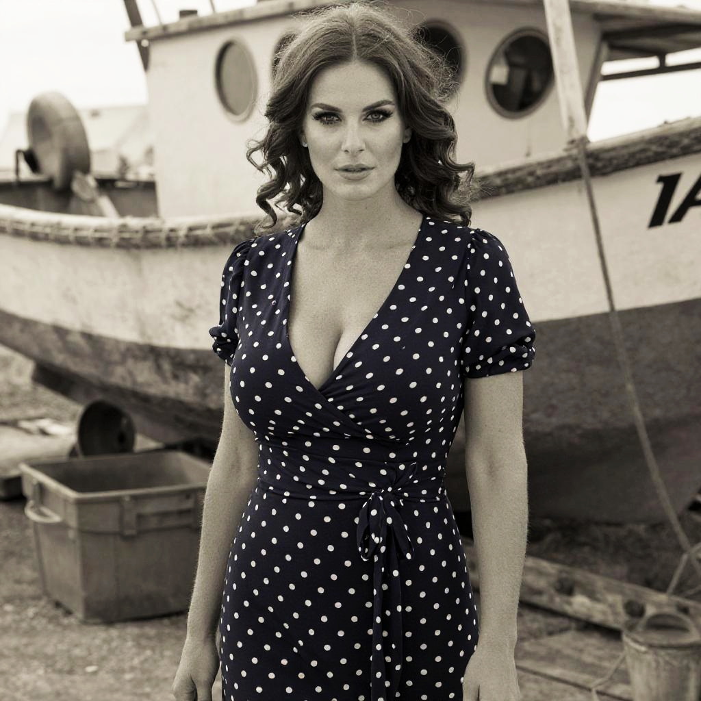 Photograph of a fair-skinned woman with wavy brown hair, standing in front of a weathered fishing boat. She wears a black, short-sleeved, deep V-neck polka dot dress that reveals some cleavage. The background includes the boat's white and black hull with visible round portholes, and a large, empty plastic bucket on the ground. The image has a slightly grainy, vintage filter, adding a retro feel. The woman's expression is confident and slightly serious. The scene is outdoors, with a rough, gravel-like ground.