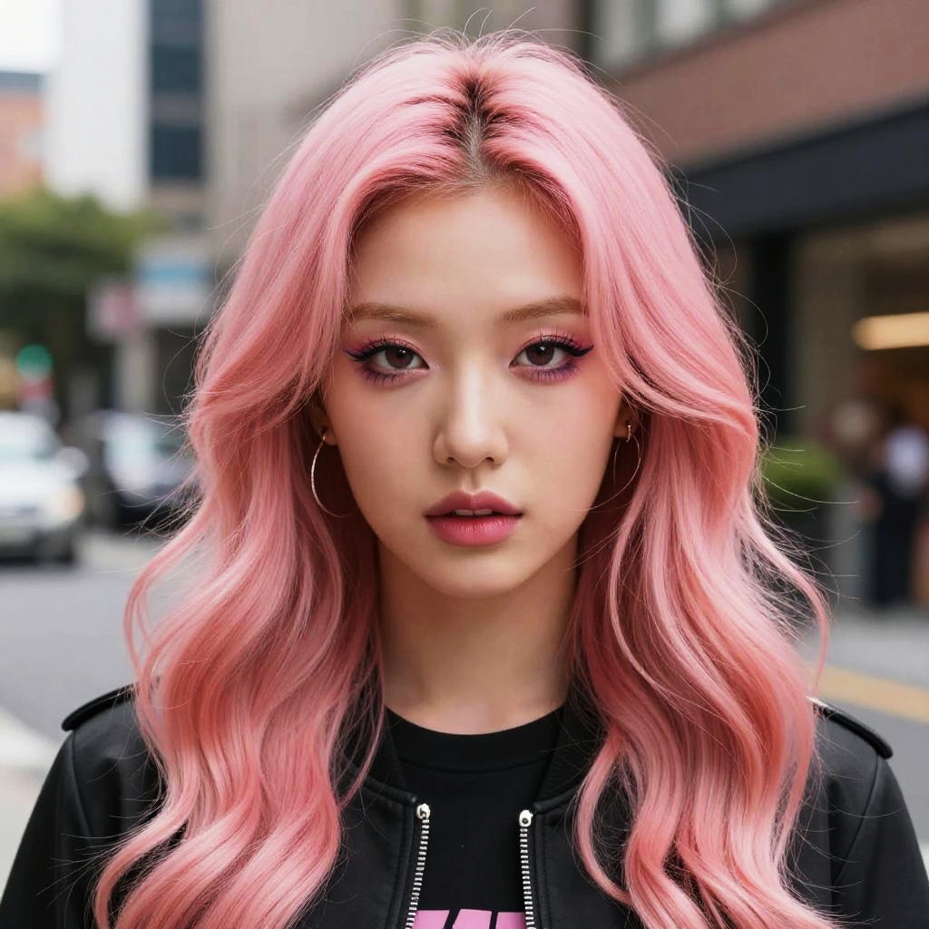 Close-up of a character with striking pink wavy hair, intricate highlights, colorful makeup, modern fashion, urban street style, bold and expressive, high contrast lighting