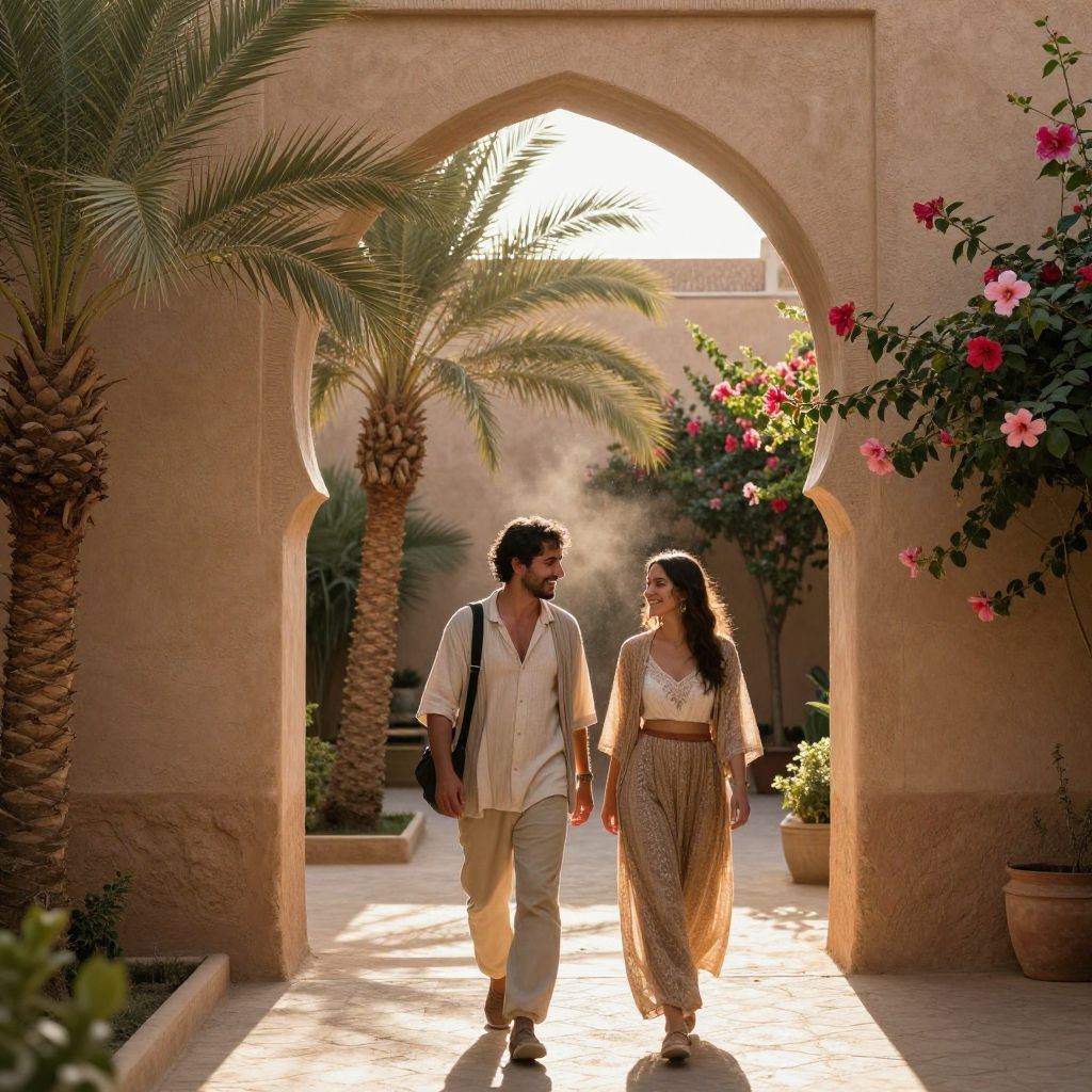 A rustic arched courtyard in a Moroccan riad, nestled between date palm trees and blooming hibiscus. Sunlight streams through a large open arch, illuminating dust motes in the air. A couple in casual desert attire walks slowly across the courtyard, the man with a warm smile and the woman smiling back, her face slightly glowing under the afternoon light.