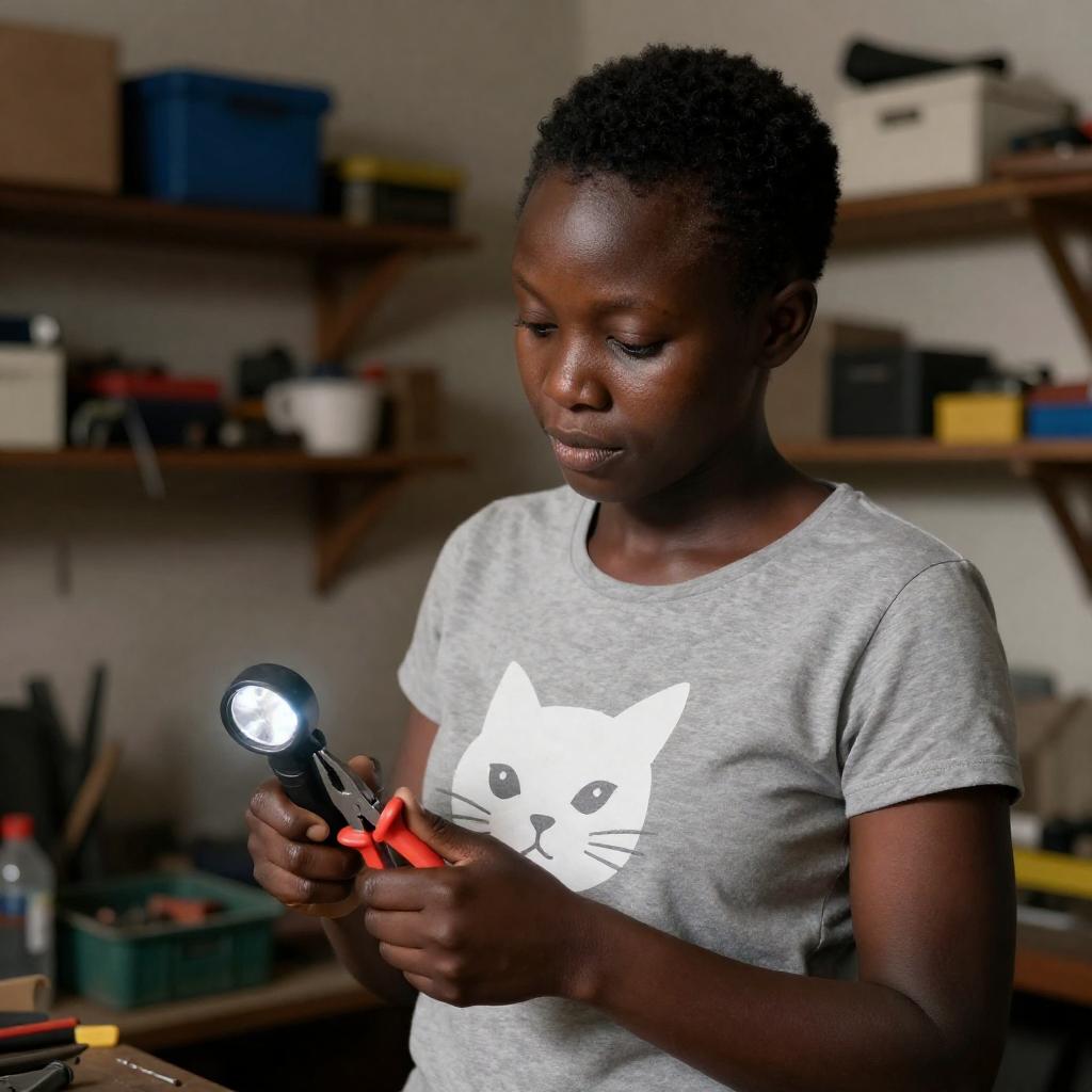 African woman with dark skin, short curly hair, and a gray T-shirt with a white cat design, holding a flashlight and pliers, stands in a dimly lit, cluttered workshop. She looks down at the tools in her hands. Shelves and objects are blurred in the background.