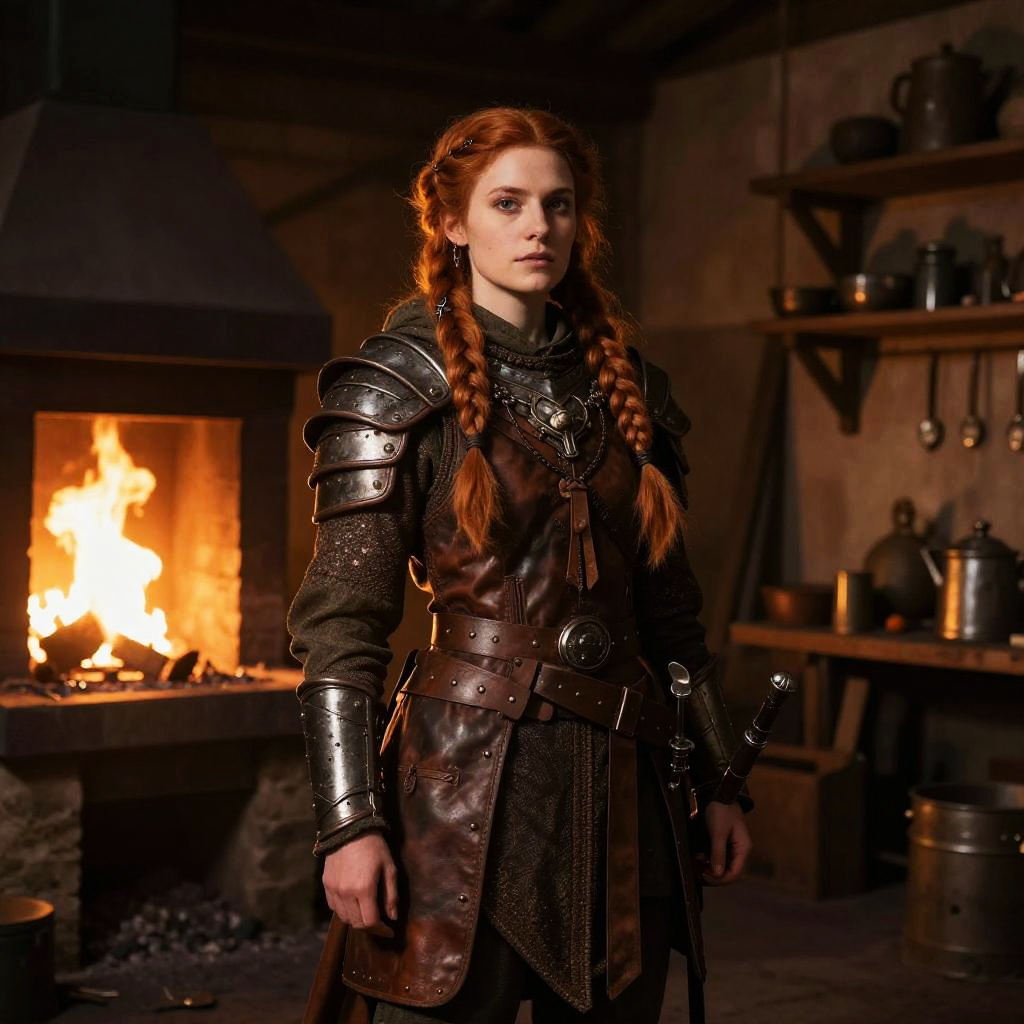 Dwarf woman with beard standing confidently in a medieval forge workshop, wearing leather armor, intricate braided hair, warm glowing light, fantasy art style