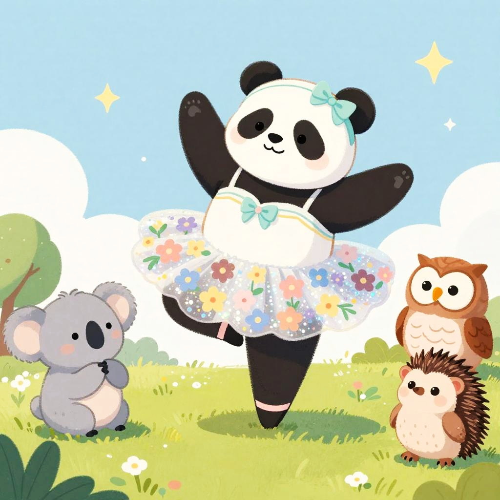 A whimsical and colorful illustration of Penny the Panda in a sparkling floral tutu with a ribbon headband, standing on her hind legs with her arms extended as if she’s dancing ballet. Her friends, a koala, an owl, and a hedgehog, are watching her in awe.