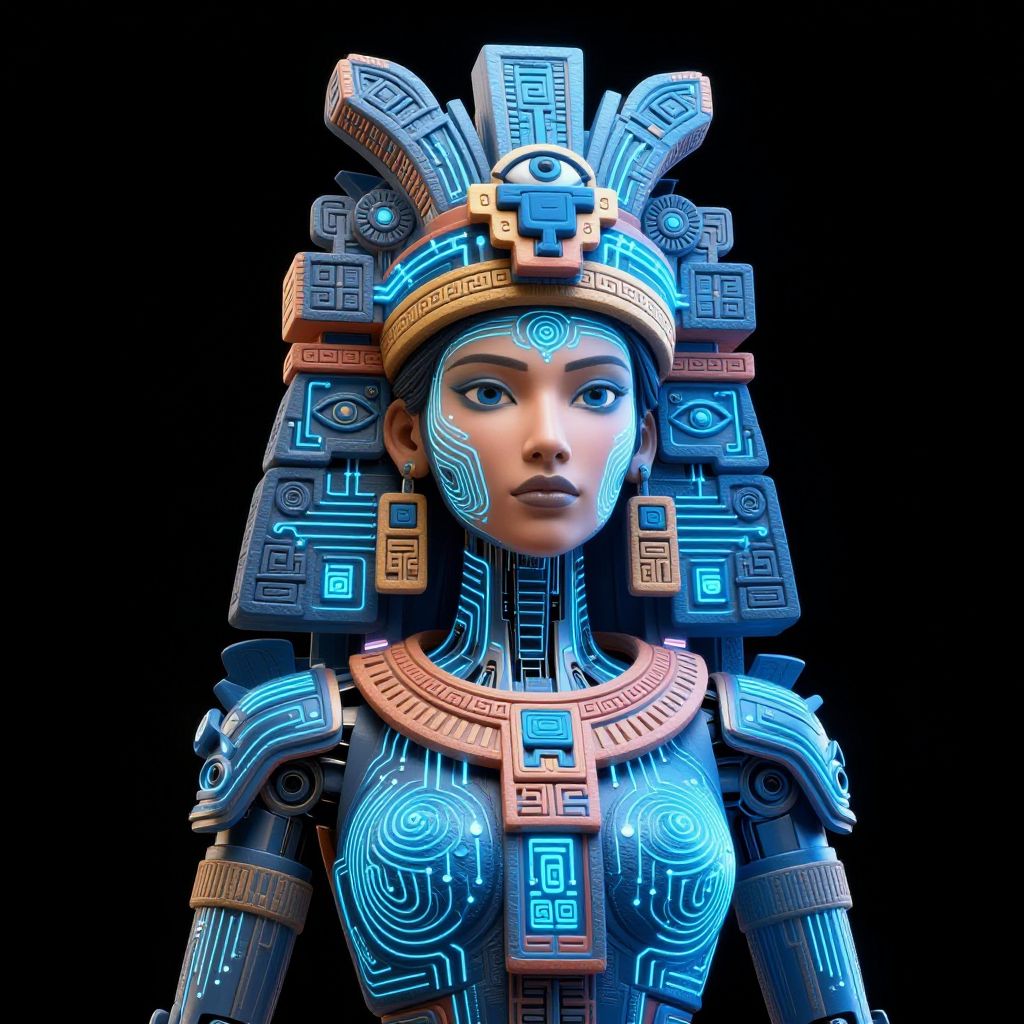 Digital 3D illustration of a futuristic female deity inspired by Mayan culture, depicted as a cybernetic robot with intricate neon blue circuit patterns and ornamental geometric designs. The artwork features a seven-layer cross-section resembling an ancient temple combined with neuron pathways, incorporating symbols like the all-seeing eye and freemasons. The figure has detailed facial features against a black background, emphasizing intense colors and clean geometry.