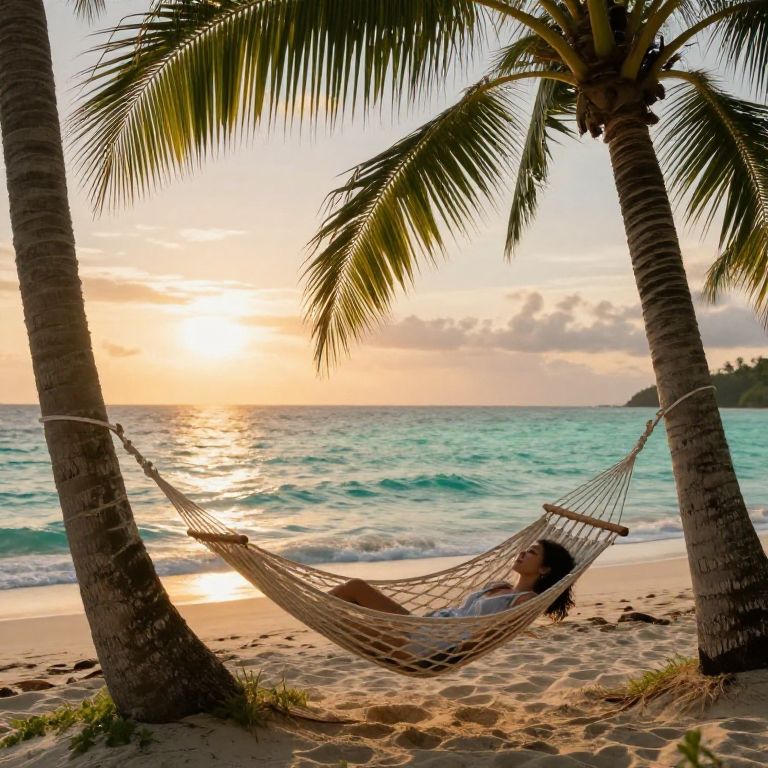 A serene scene of a person reclining with eyes closed in a hammock tied between two palm trees on a tropical beach at sunset. Soft golden light reflects on the calm turquoise ocean waves, creating a peaceful and tranquil atmosphere. The sandy shore and gently swaying palm fronds enhance the tropical vibe.