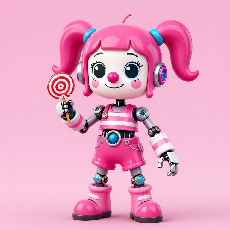 Humanoid Robots cartoon female character in a pink outfit holding candy, in the style of photobashing, clownpunk, daz3d, painted illustrations, robotics kids, striped, vivid color scheme,