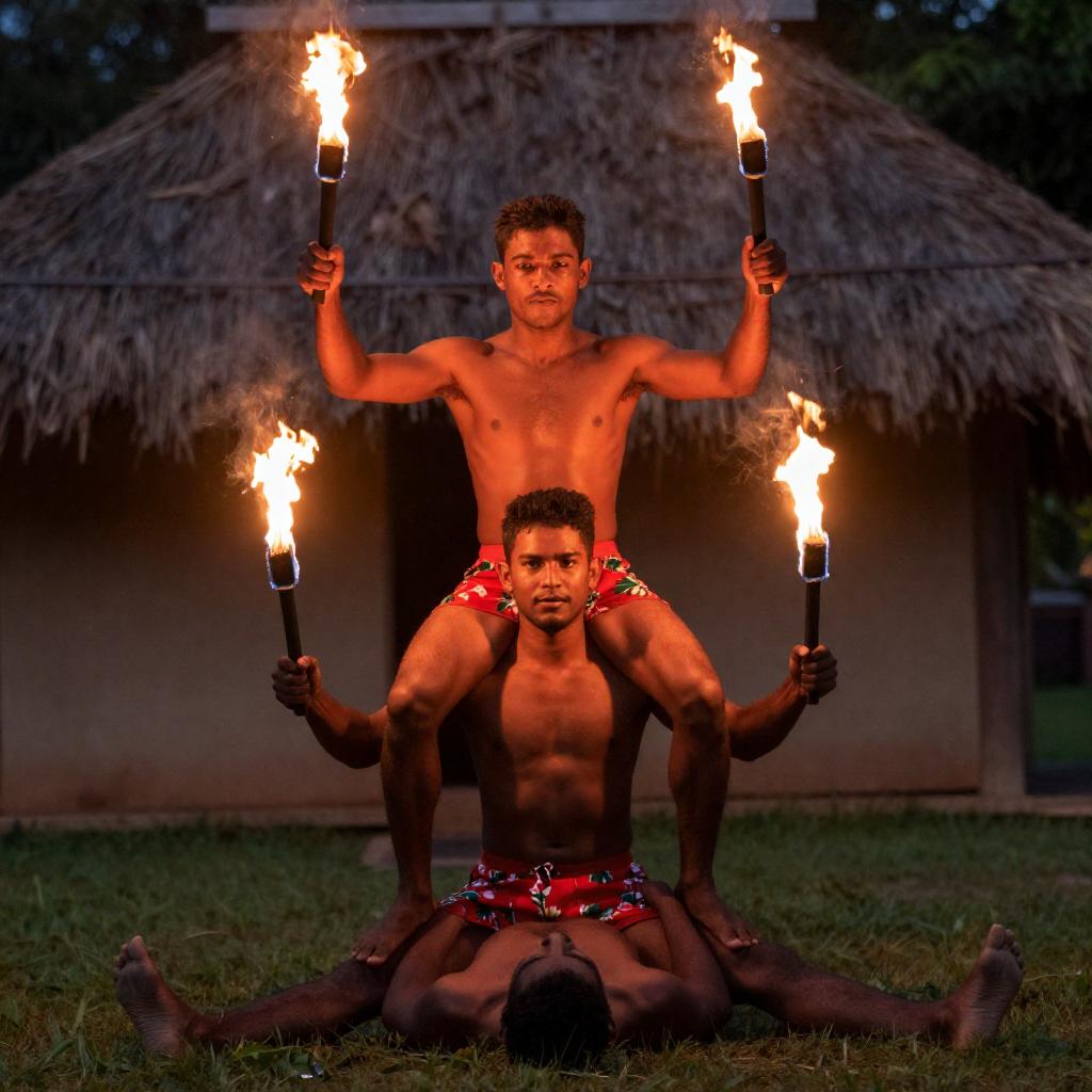 Photograph of two men outdoors. One man in black clothes and cap lies on a mat, holding a bottle, while the other in a white t-shirt and blue shorts stands, holding a rope. They are in front of a thatched hut with wooden beams and a grassy ground.