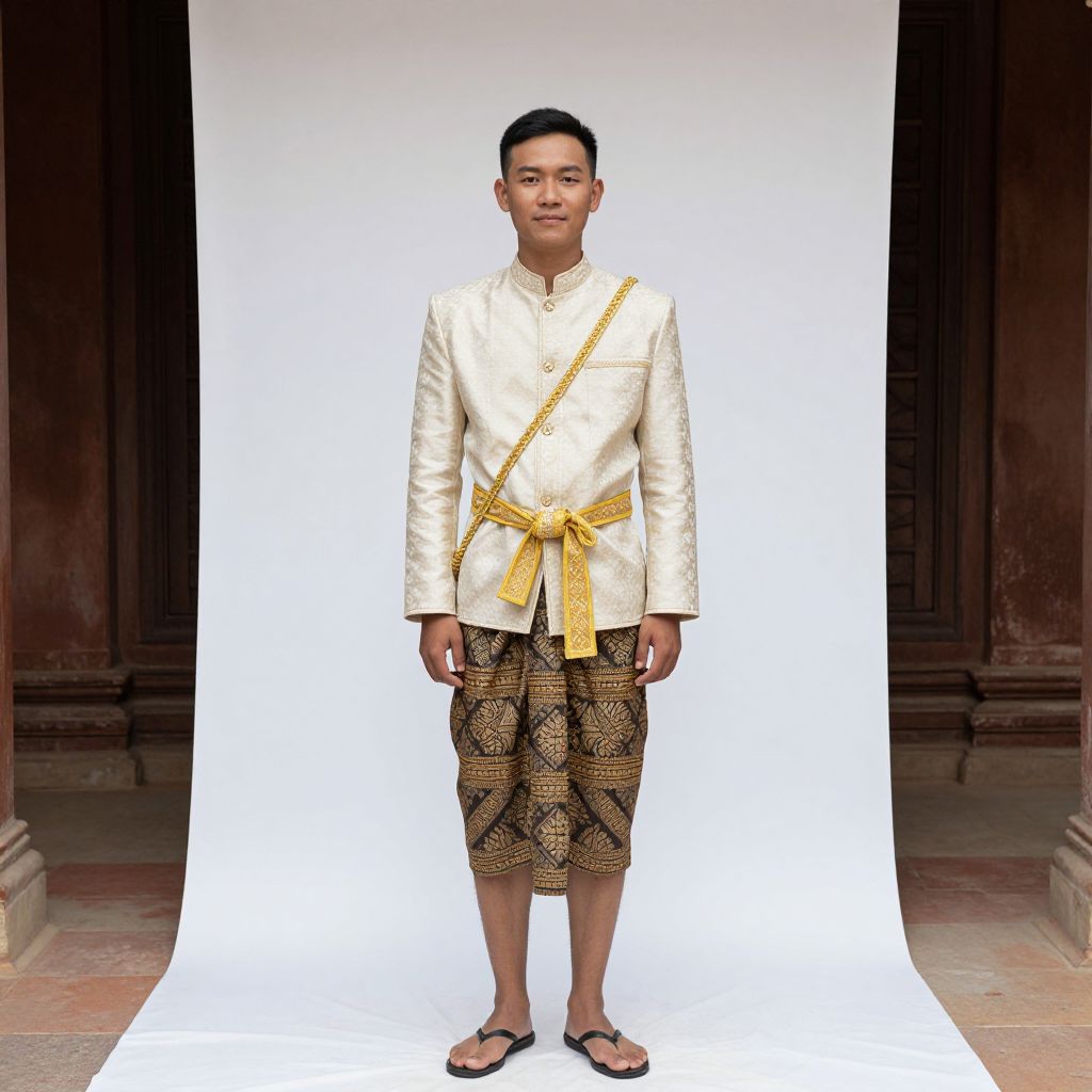 National Costume Cambodia Male, man in traditional thai costume standing in front of a white backdrop
