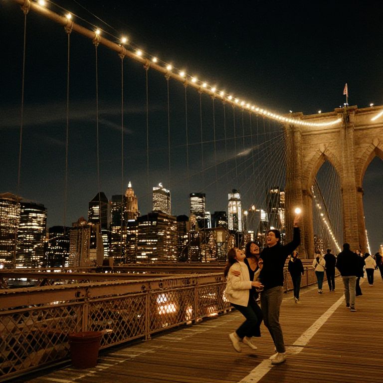 Photograph of the Brooklyn Bridge at night, showcasing illuminated streetlights along the bridge's cables and walkway. The bridge's stone arches and wooden planks are visible. Several pedestrians, including a man in a black jacket and a woman in a white coat, walk across the bridge. The city's skyline, featuring brightly lit skyscrapers, is visible in the background. The sky is dark, contrasting with the warm lights of the bridge and buildings. The overall scene is vibrant, with a mix of urban architecture and lively night-time activity.