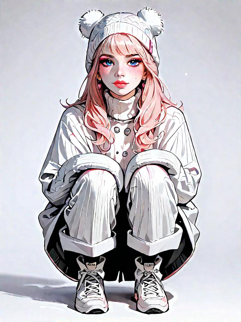 1girl, source_comics, realistic face, full body shot, Woman, winter chic, iridescent mint green puffer jacket, oversized fit, high collar, white wool beanie, coordinating mint green skinny pants, fur trim at the cuffs, black snow boots, gloves, studio background.