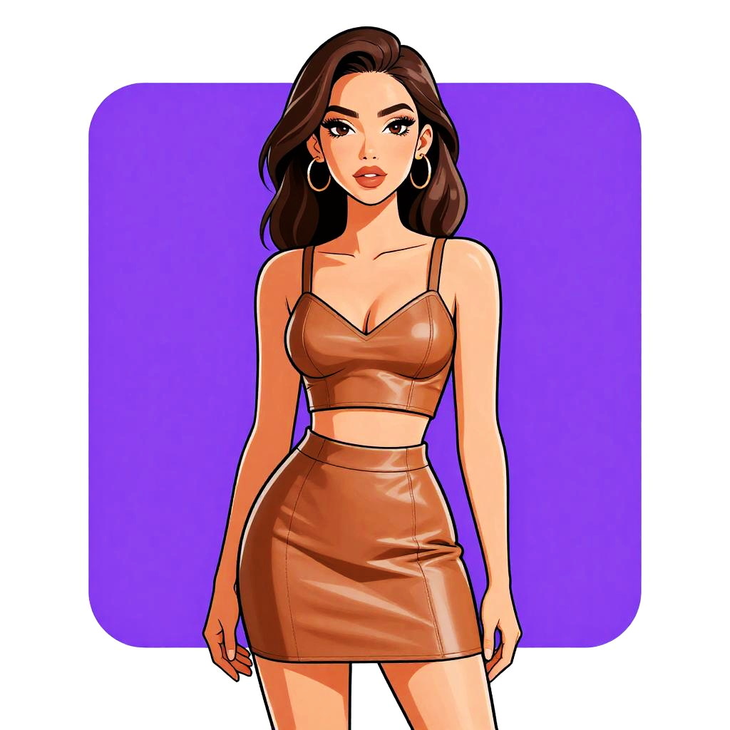Digital illustration of a confident woman with dark hair, wearing a brown leather crop top and matching mini skirt, hoop earrings, against a purple square background.