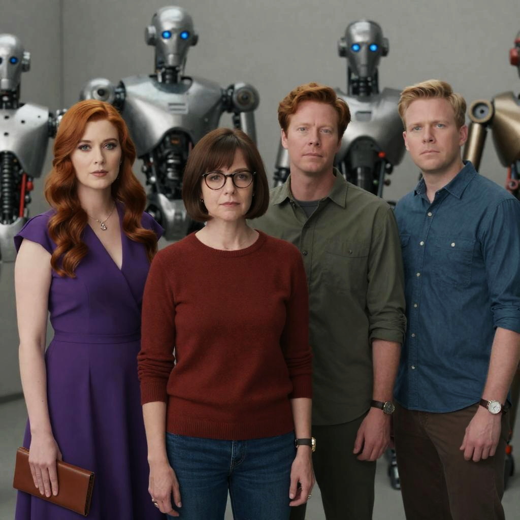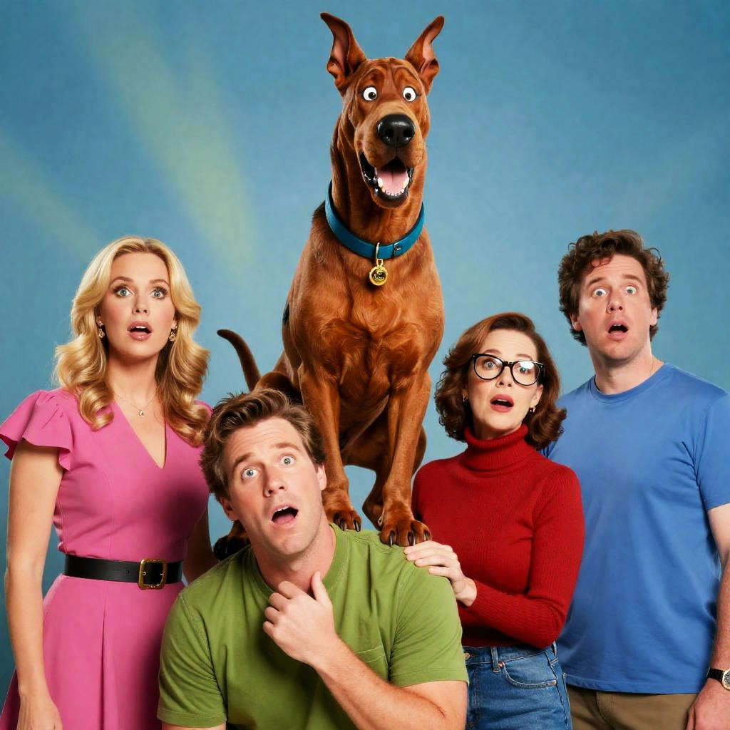 Photograph of "Scooby-Doo" cast. Brown Great Dane in blue collar, mid-leap, over man's shoulder. Four people: blonde woman in pink dress, man in green shirt, woman in red turtleneck and glasses, man in blue shirt. Blue and green dynamic background. Intense, surprised expressions.