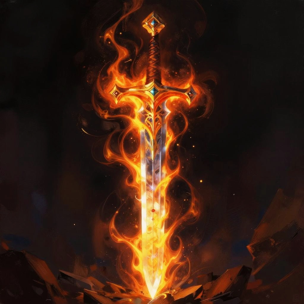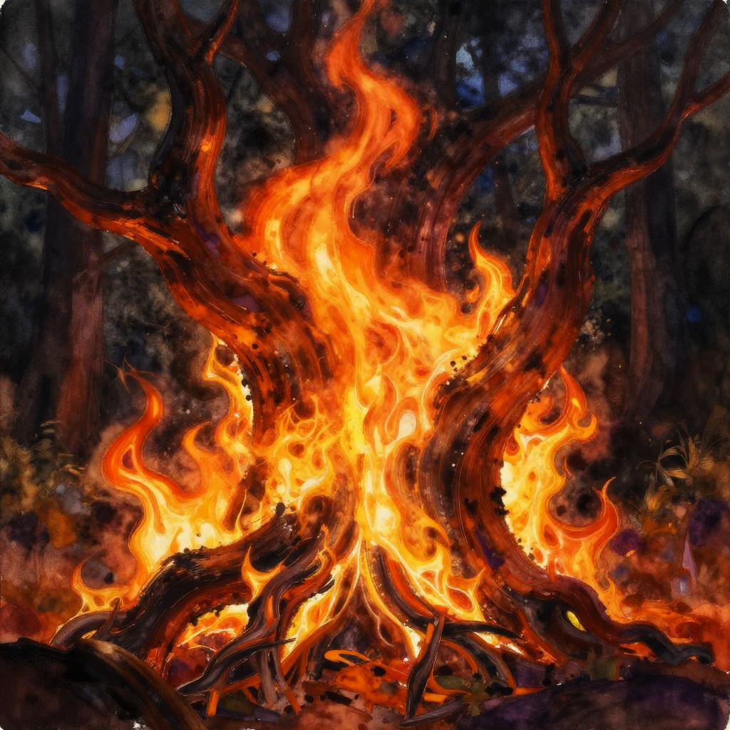 Vivid digital painting of a forest fire blazing among tall pine trees, with bright orange flames and smoke rising. A calm river runs through the scene, reflecting the intense fire colors and surrounding trees.