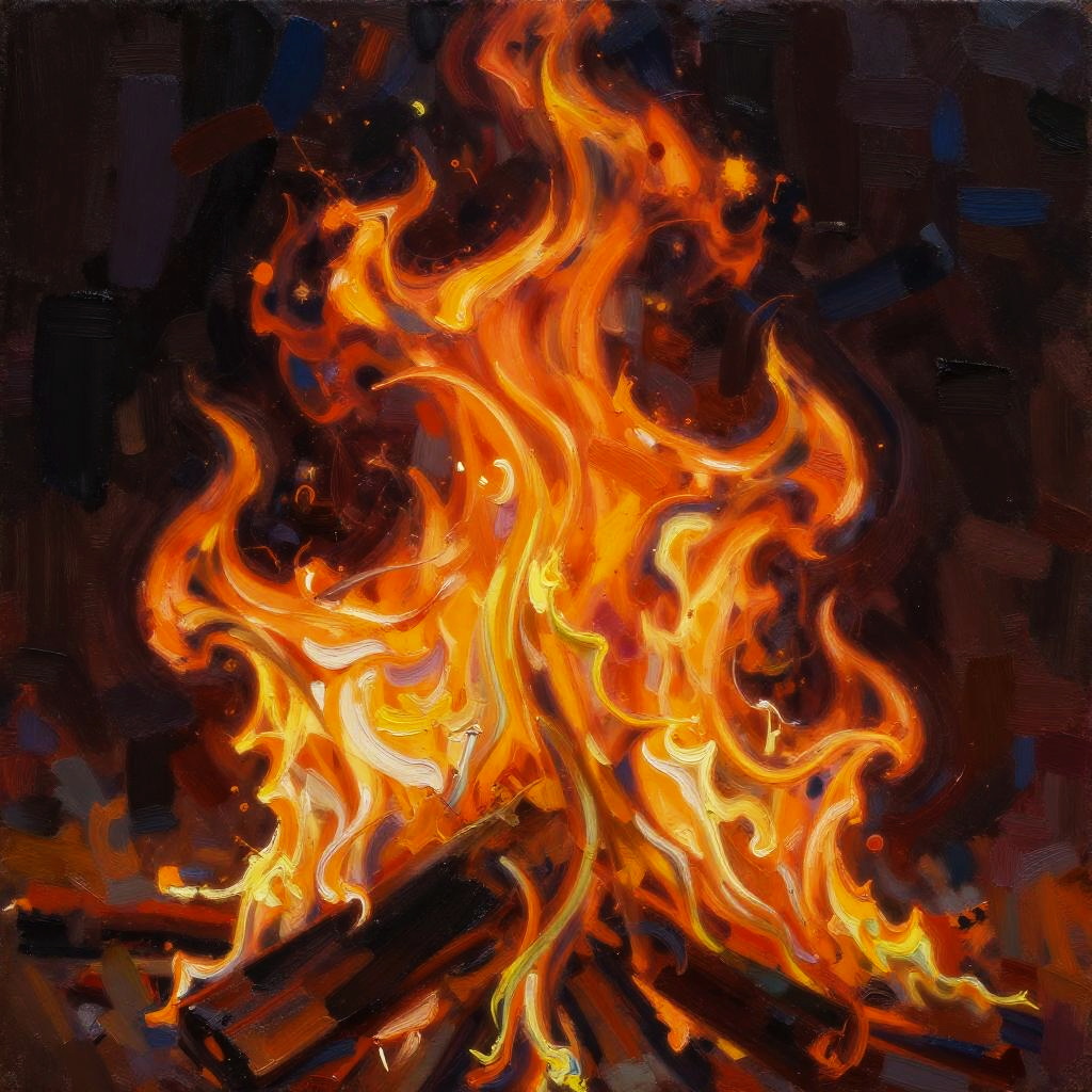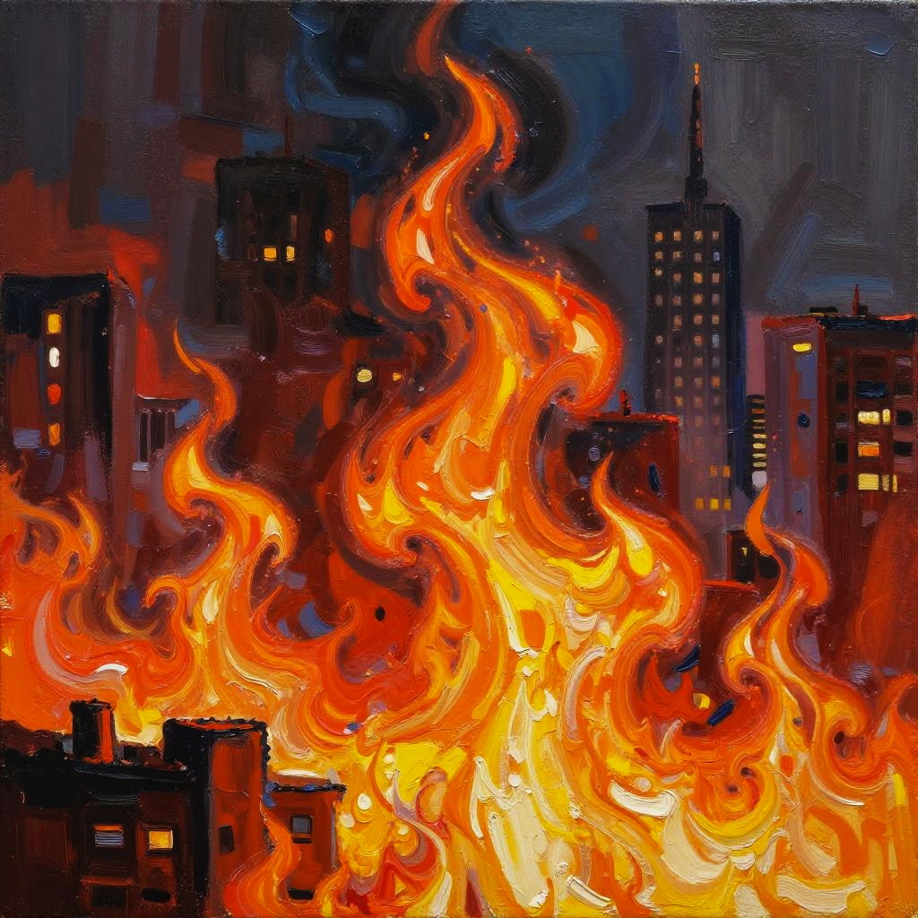 The flames are coming for you and nothing can stop them, a forest fire, thick paint, thick brush strokes, oil painting, colorful, detailed, sharp