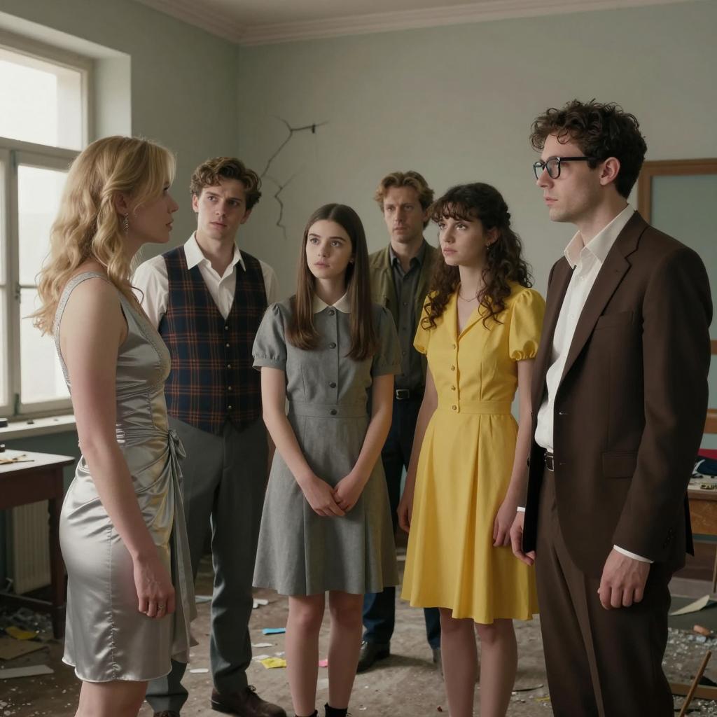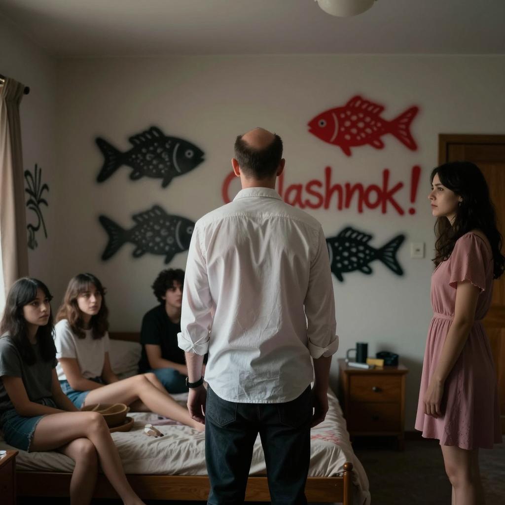 A dimly lit room. A man in a white shirt with balding head stands in front of a graffiti-covered wall with red and black fish drawings and the word "Clashnok!" Three people sit on a bed to the left, partially obscured. A woman in a pink dress stands to the right.