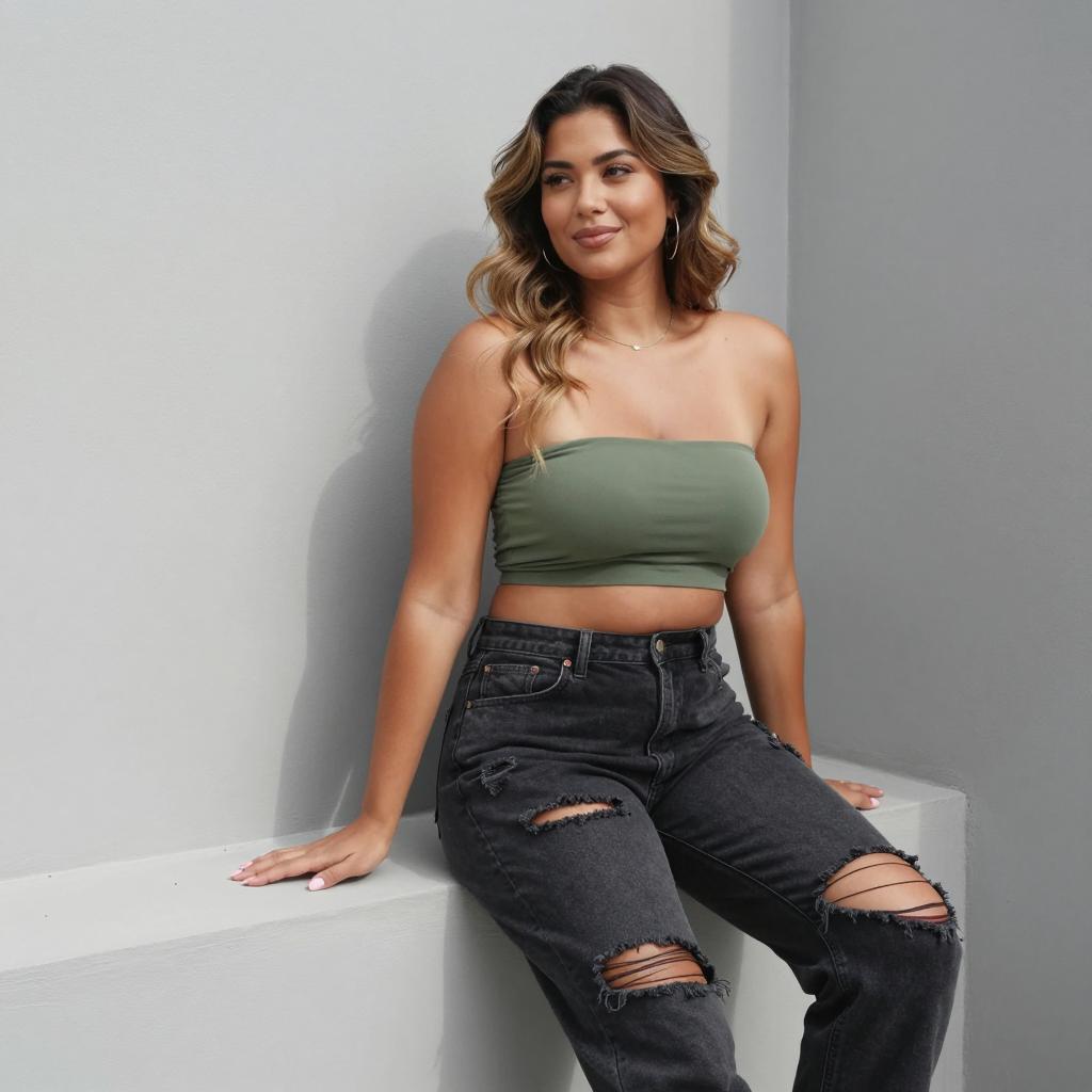 1girl, woman, large breasts, wearing ultra-short bandeau crop top and high-waisted relaxed-fit ripped jeans in olive green top with black ripped jeans on mixed-heritage woman with wavy ombré hair and soft glam posed perched on a stair step, elbows resting on her thighs, relaxed smile in minimal outdoor corner with smooth light grey wall at Ubud rice terraces in Bali under strong midday sunlight creating sharp shadows, laid-back summer lifestyle fashion photography, high resolution, ultra-detailed
