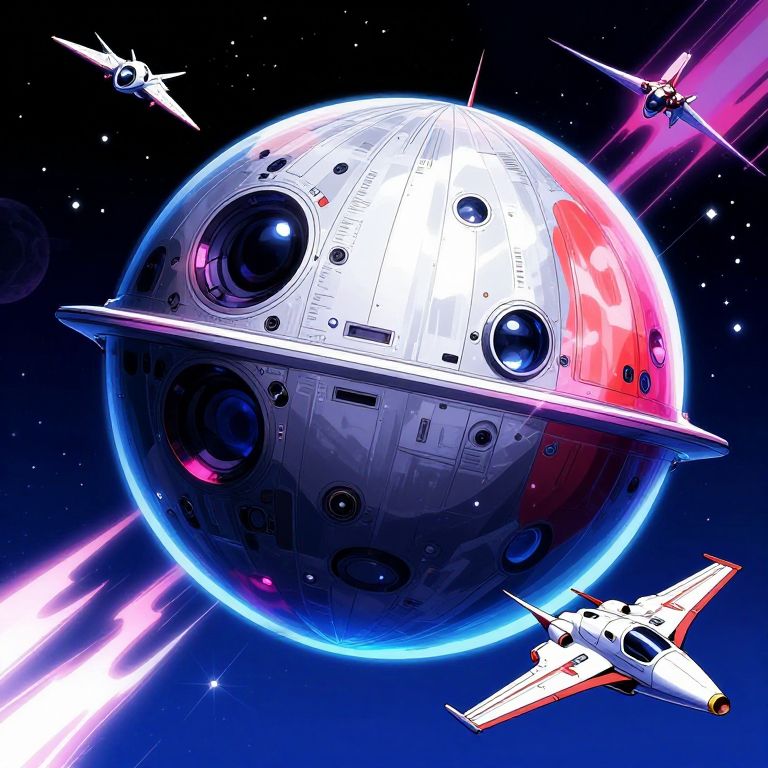 This vibrant digital illustration depicts a space scene with a large, illuminated space station sphere at the center, featuring a white, detailed exterior with several circular windows and panels. The sphere has a red and white gradient on its upper right. Surrounding the sphere are four sleek, white and orange starfighters with bright, pink and white trails, flying in various directions. The background is a deep blue, star-filled space, creating a dynamic, sci-fi atmosphere. The image uses bold colors and sharp contrasts, typical of modern digital art styles, emphasizing the futuristic and adventurous theme.