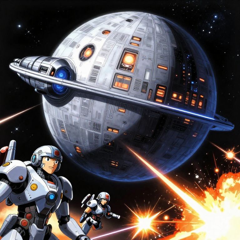 Vibrant anime interpretation of the Death Star, featuring sleek mechanical design and vivid neon highlights, anime characters in futuristic armor flying sleek starfighters nearby, starry backdrop with distant planets, bold outlines and motion blur effects.
