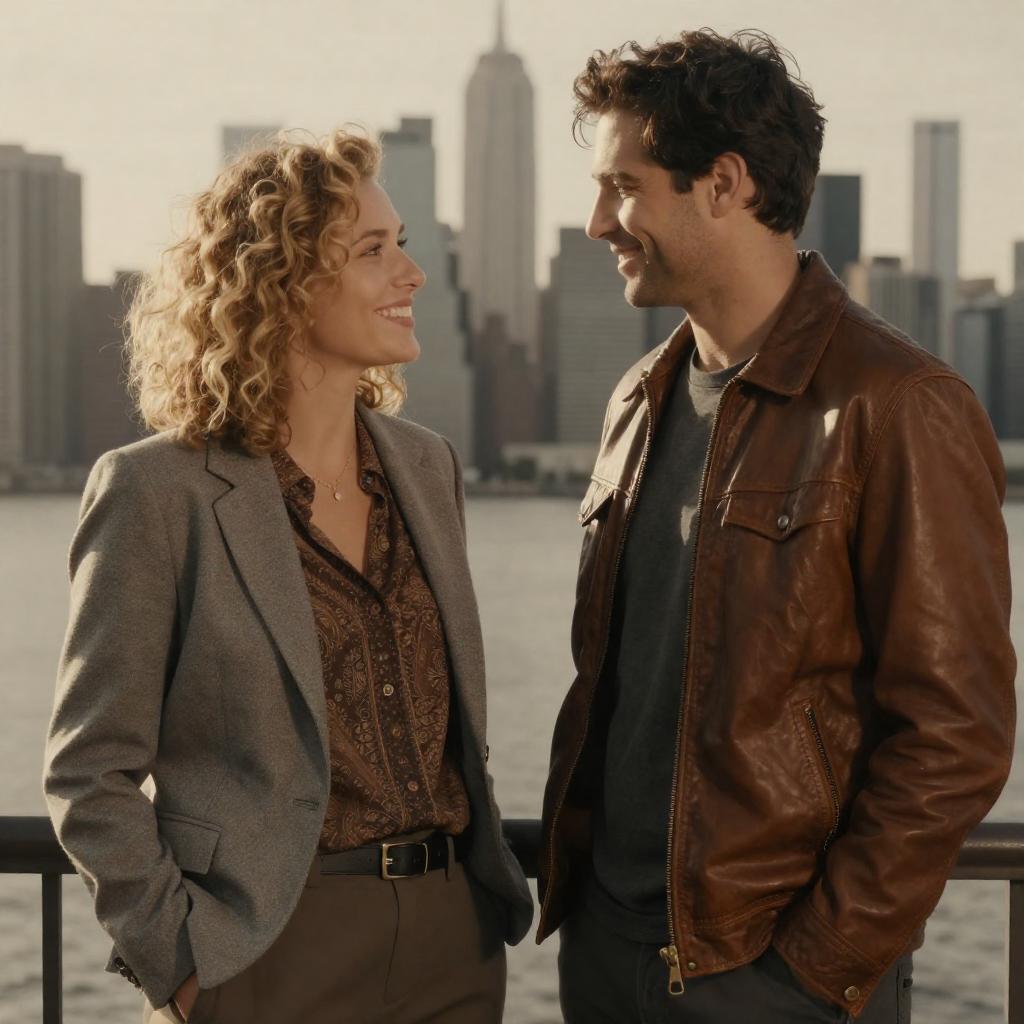 Photograph of a man and woman in a car. Woman with blonde, curled hair in a blue, ured coat and colorful scarf. Man with dark hair, brown jacket, and checkered shirt, holding a blue microphone close to her face. Both looking at each other. Woman's arm around man's shoulder. Dark car interior, blue background. Intimate, focused expressions.