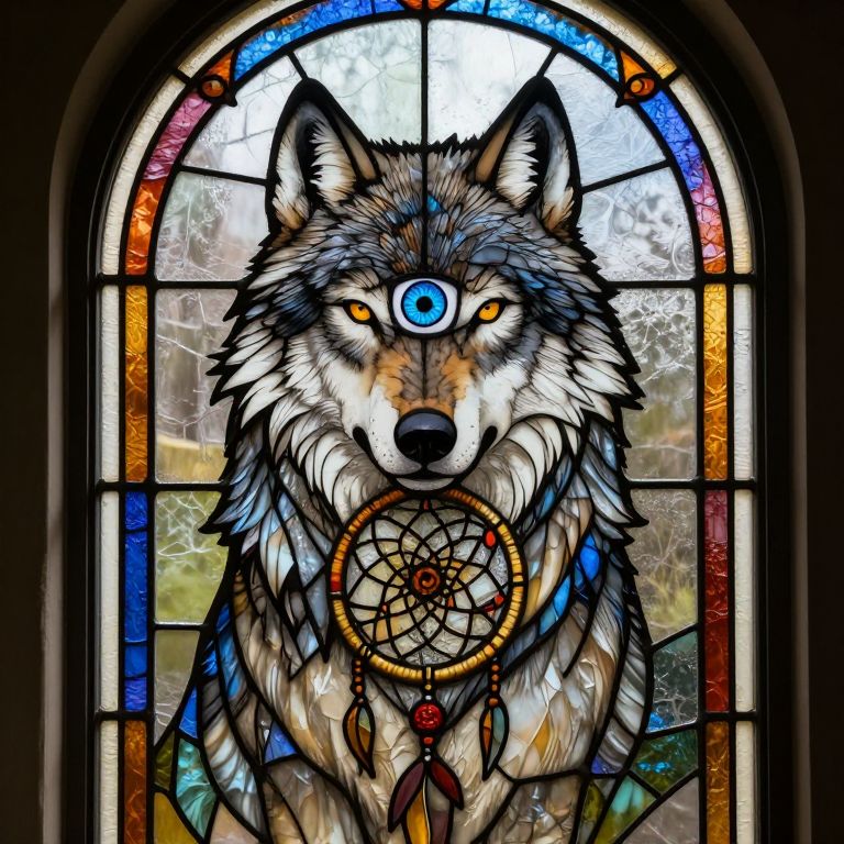 A stained glass window featuring a wolf with a third eye, adorned with intricate designs and a dreamcatcher symbol.