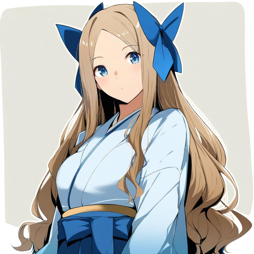 Asakaze (kancolle), kantai collection, 1girl, blue eyes, long hair, wavy hair, light brown hair, brown hair, parted bangs, sidelocks, hair bow, meiji schoolgirl uniform, meiji schoolgirl uniform, hakama skirt, blue bow, forehead, blue hakama, by artist yuuyuu (yuuki1771), animagine