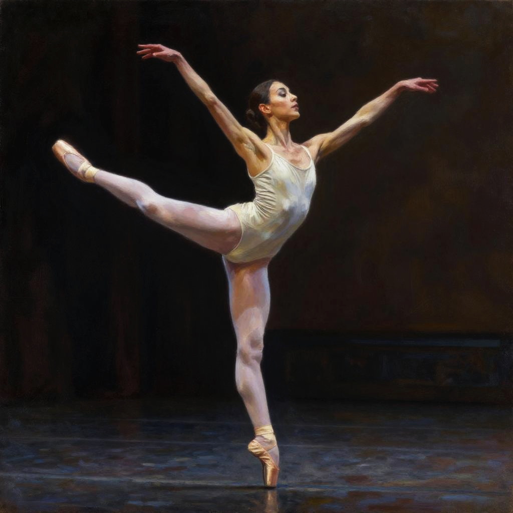 Realistic photo.graceful ballerina performing on a grand stage, printed on it, realistic oil painting, focused expression, detailed muscles, dramatic lighting, dark and earthy tones, high quality, realistic, intense, dramatic lighting, detailed muscles, powerful, earthy colors, realistic oil painting, focused expression realistic photo