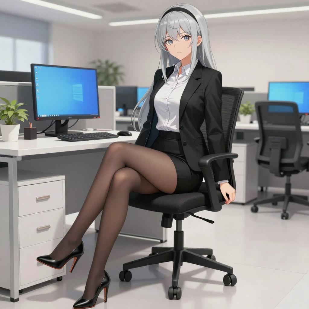 Digital art, anime style, female, long silver hair, black hairband, black blazer, white shirt, black mini skirt, black high heels, crossed legs, office chair, office setting, computer monitors, blue screens, desk, drawers, potted plant, white tile floor, bright lighting, confident expression, business attire, professional, modern office, sleek furniture