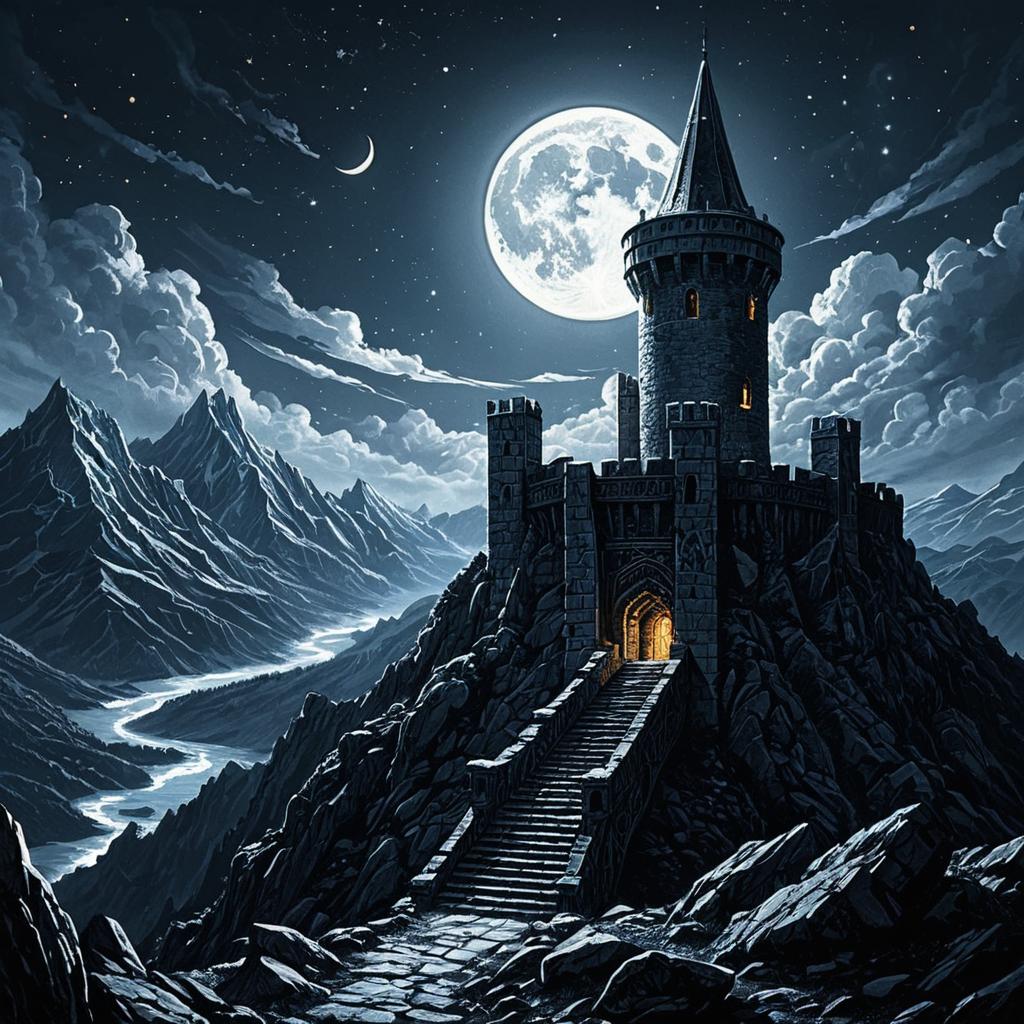 Detailed illustration of a tall stone tower atop a rugged mountain peak, with a winding stone path leading to its entrance. The tower is illuminated by a large full moon positioned perfectly behind its spire, casting a luminous glow. The surrounding landscape is mountainous with dramatic clouds and a starry night sky, evoking a mystical and fantasy atmosphere.
