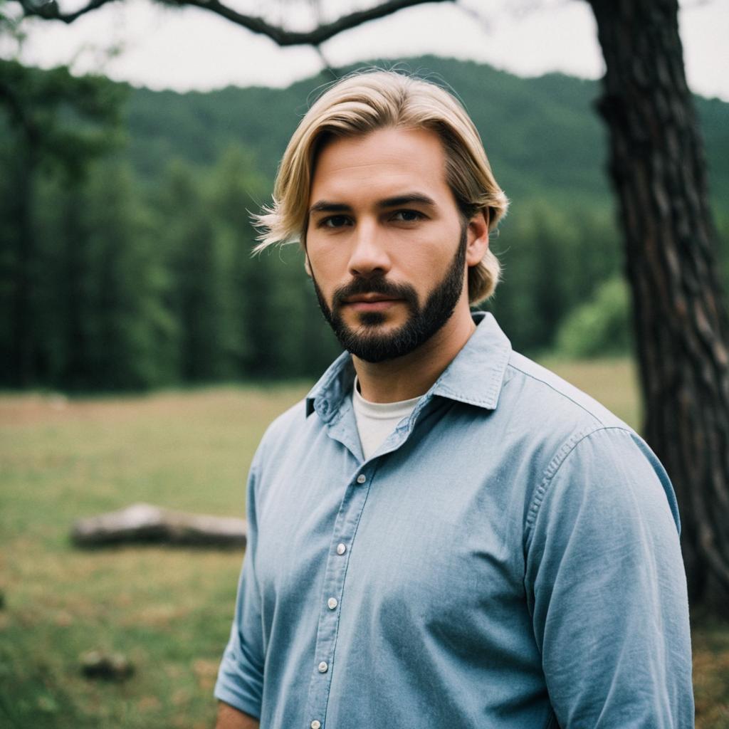 Costume large man,1boy, male focus, solo, facial hair, outdoors, blurry background, realistic, brown hair, looking at viewer, blurry, standing, beard