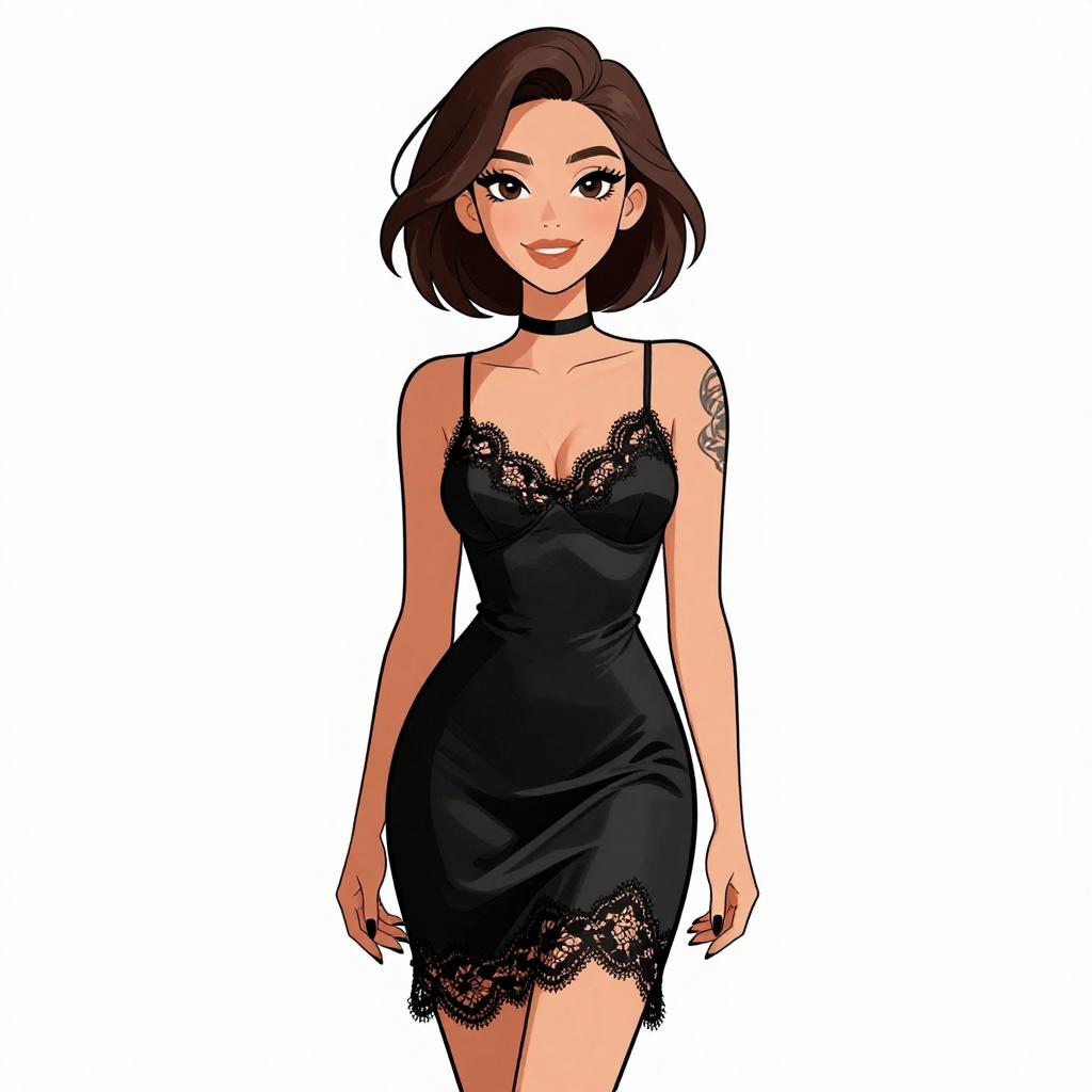 Woman with pretty face and pretty hair. smiling Woman, boudoir-inspired, satin slip dress in black, delicate lace trim at neckline and hem, thin adjustable spaghetti straps, knee-length, slight slit on one side, choker necklace, tattoo on arm, white studio background --sref 1467