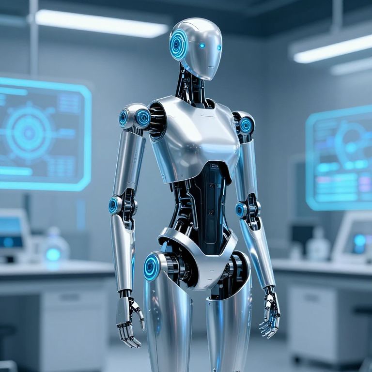 Photorealistic digital illustration of a sleek, silver humanoid robot standing in a futuristic laboratory. The robot has a glossy metallic finish, with blue glowing circular accents on its joints and eyes. Its torso and limbs are intricately detailed, showcasing mechanical segments and joints. The background features blurred, glowing blue computer screens displaying technical diagrams, and a gray workstation with various lab equipment. The image uses a cool blue and gray color palette, enhancing the high-tech, sci-fi atmosphere. The robot stands centrally, facing forward, with arms slightly bent at the elbows.