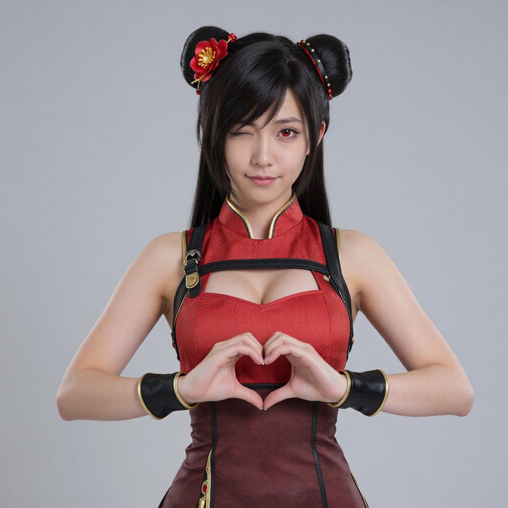 Photograph of an Asian woman with fair skin and black hair styled in two buns, adorned with red and gold hairpins. She wears a tight, red, sleeveless cheongsam with a high neckline and black straps, showcasing her medium-sized breasts. She forms a heart shape with her hands in front of her chest. Her right eye is winking, and she smiles slightly. The background is a plain, light blue. She has black wristbands with gold accents. The image has a clean, studio-like quality with even lighting.