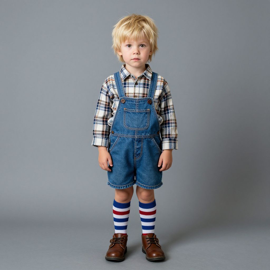 Raggedy ann costume toddler, solo, overalls, striped socks, realistic, male focus, 1boy, socks, shirt, full body, striped clothes, plaid shirt, parody, shoes, standing, brown footwear, blonde hair, looking at viewer