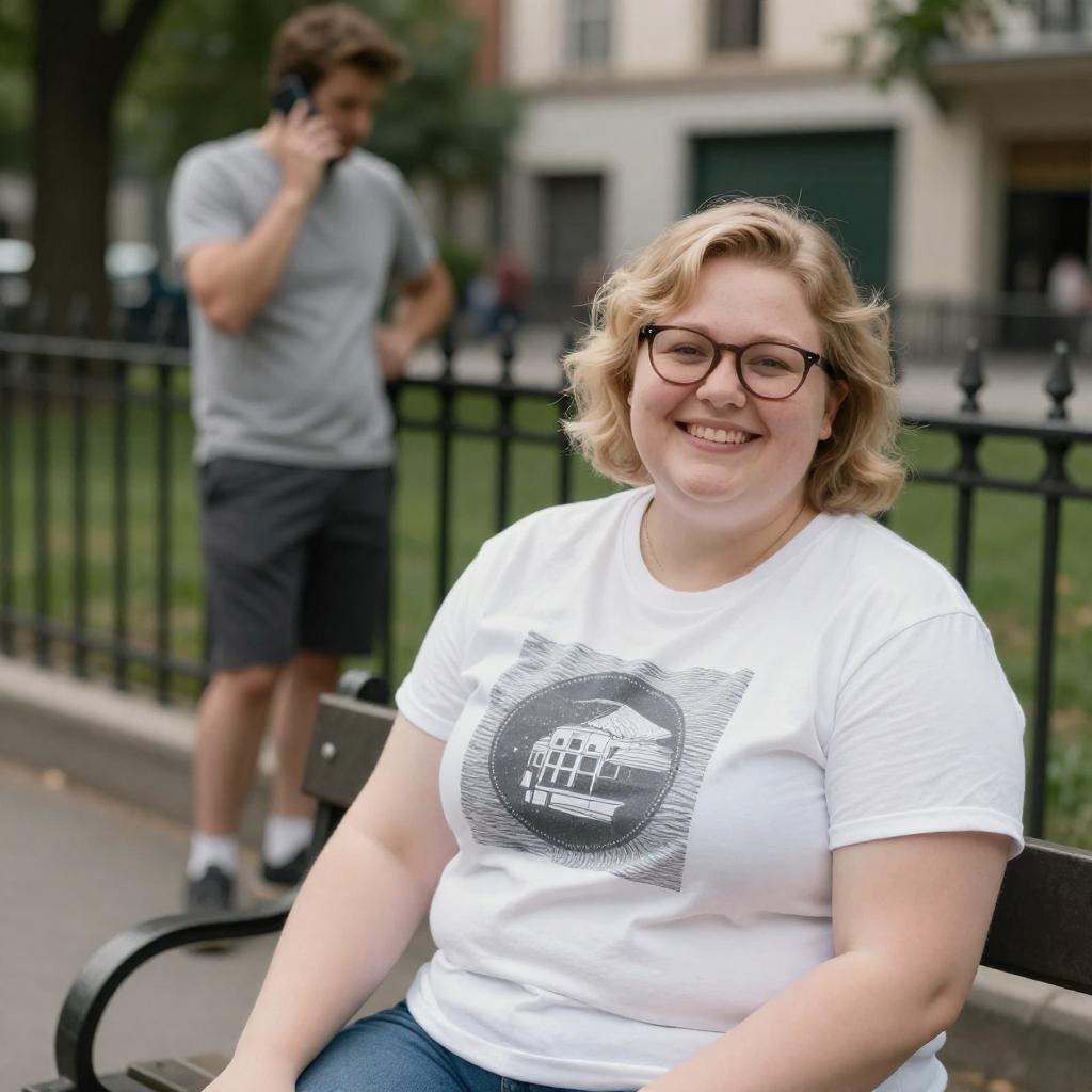 Photograph of a smiling, overweight blonde woman with glasses, wearing a white T-shirt with a graphic, leaning on a bench. In the background, a man in a gray shirt and shorts stands talking on a phone. Iron fence, green grass, and trees are visible. Urban park setting.