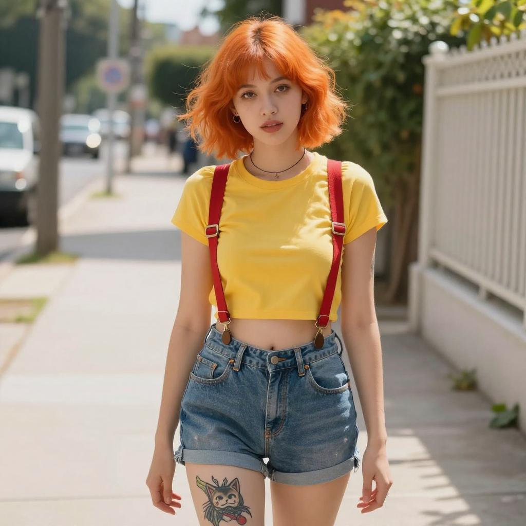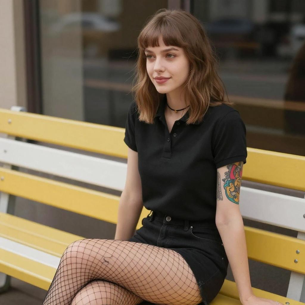 Photograph of a young woman with light brown, shoulder-length hair and blunt bangs, sitting on a yellow and white striped bench. She wears a black short-sleeve polo shirt, fishnet stockings, and has a colorful tattoo sleeve on her right arm. She gazes to the side with a slight smile. The background is blurred, suggesting an urban setting.