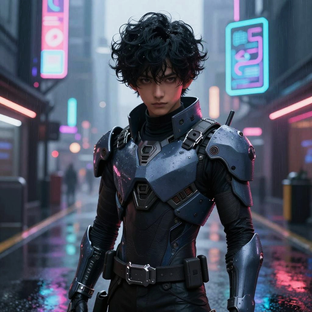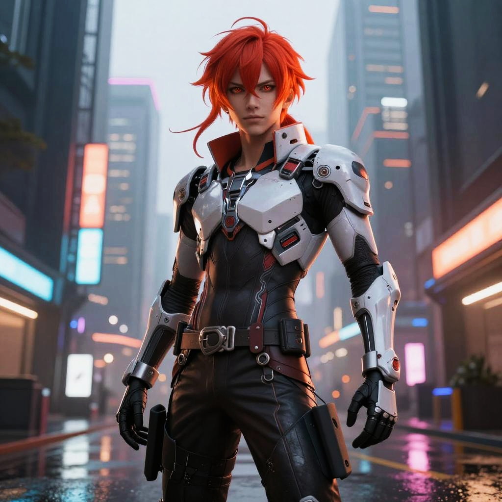Red hair anime character male standing confidently in a futuristic cityscape at dusk, vibrant orange-red hair flowing, sharp eyes glowing, detailed cyberpunk armor, neon lights reflecting on wet streets, dynamic pose, high contrast lighting, cinematic composition.