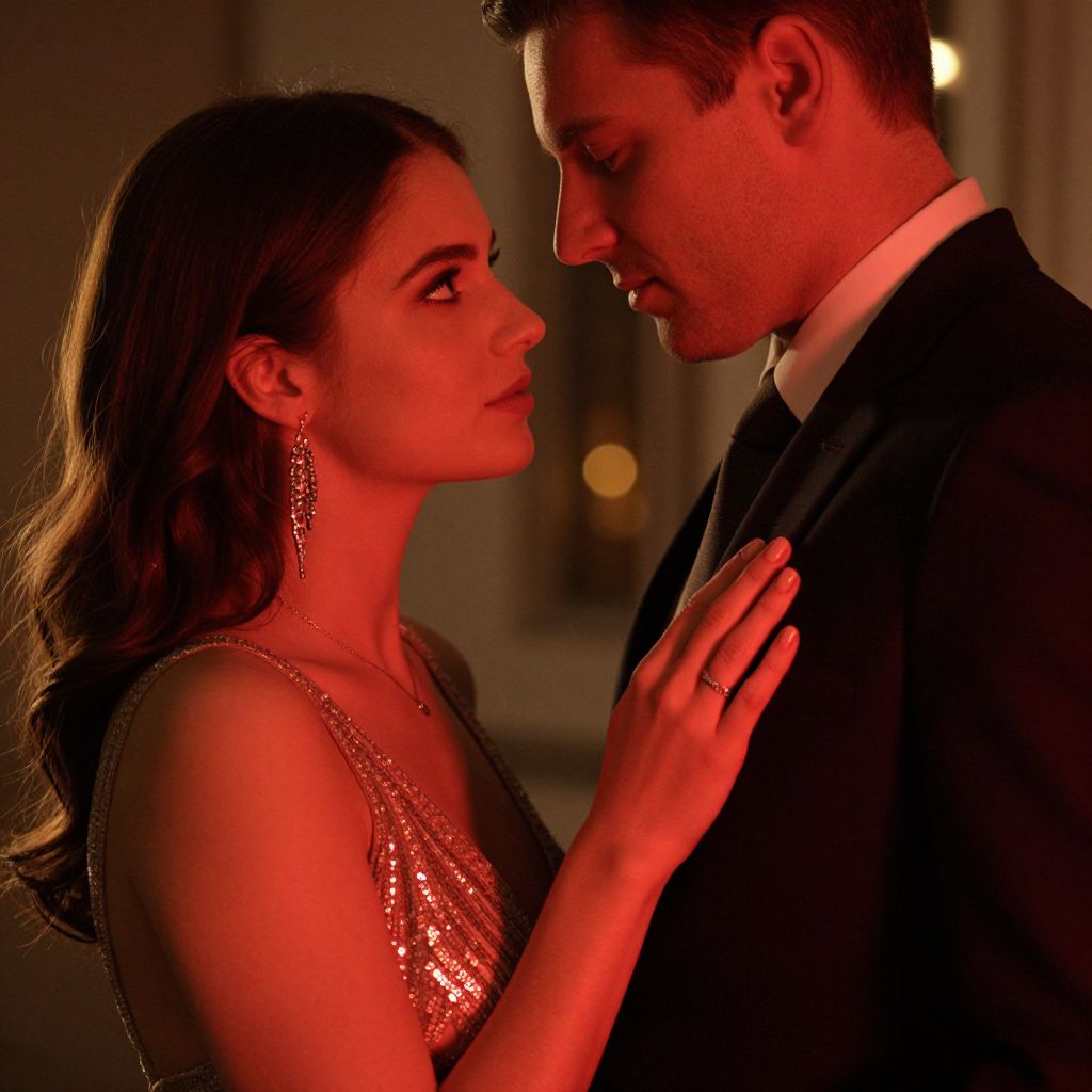 Romantic embrace captured in warm, red-hued lighting as a woman in a shimmering dress and dangling earrings gently rests her hand on a man's lapel, both gazing tenderly at each other against a backdrop of soft bokeh lights.