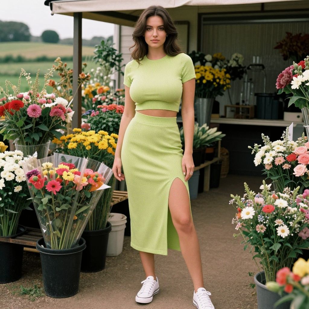 A Lean woman, styled in Ilford film stock, wearing a casual chic lime green ribbed two-piece set with a short sleeve crop top and matching high-waist midi skirt featuring a thigh-high slit, paired with white low-top sneakers. She stands in a flower shop in a rural countryside, surrounded by vibrant blooms, with minimal makeup and loose hair. Sexy. Pretty face and beаutiful eyes. Big breasts