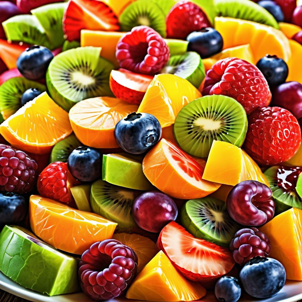 Macro gourmet photography of colorful fruit salad in HDR, professional quality with vibrant details.