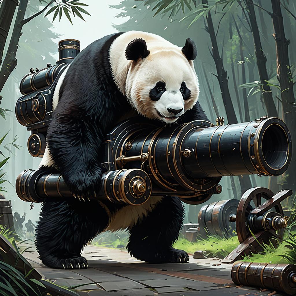 Highly detailed digital painting of a giant panda bear standing upright, equipped with an elaborate steampunk-style cannon on its back and holding the barrel. The scene is set in a dense bamboo forest with mist and muted light, showcasing intricate metallic and wooden details on the cannon. The artwork reflects a blend of natural and mechanical elements in an elegant and concept art style.